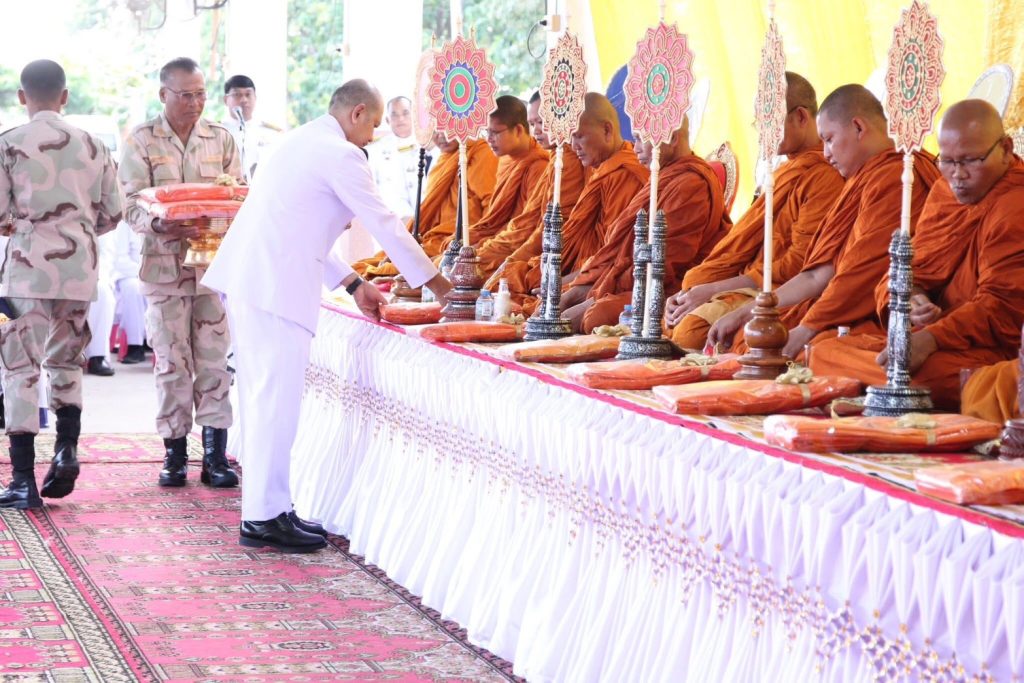 เวลา ๐๗.๓๐ น. พระสงฆ์สมณศักดิ์สวดเจริญพระพุทธมนต์ อนุโมทนา ประธานในพิธีถวายผ้าไตร และตักบาตรถวายพระราชกุศล