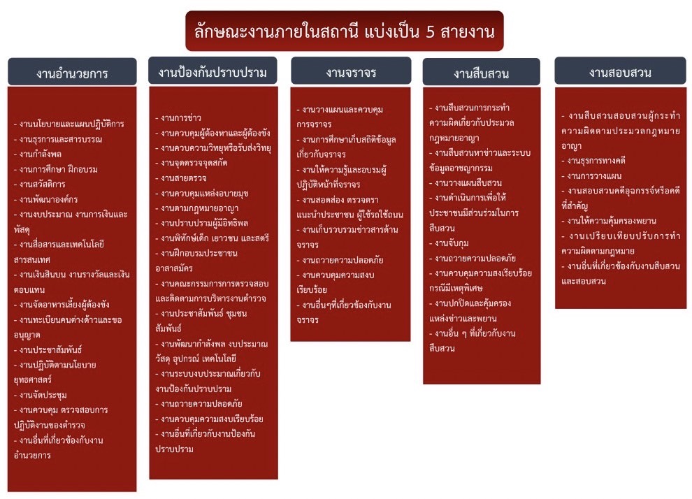 มีหน้าที่เกี่ยวกับการอำนวยการ การวางแผน การตรวจสอบติดตามและประเมินผลงานที่เกี่ยวกับนโยบาย ยุทธศาสตร์ และแผนงานของสถานีตำรวจ งานการบริหารบุคลากร งานจเรตำรวจงานกิจการพิเศษ งานความมั่นคง การศึกษา การฝึกอบรม งานวิชาการ สวัสดิการ การพัฒนา การบริหารจัดการ งบประมาณ การเงิน การพัสดุ การพลาธิการและสรรพาวุธ การส่งกำลังบำรุง รวมทั้งลักษณะงานอื่น ๆ ที่เกี่ยวข้องหรือเป็นส่วนประกอบของงานดังกล่าว เพื่อส่งเสริมหรือสนับสนุนการปฏิบัติงานของสถานีตำรวจ